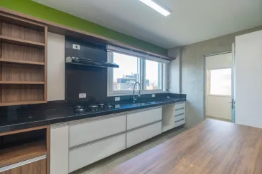 - Cozinha em conceito aberto com armários planejados, cooktop, depurador de ar e forno embutido,
