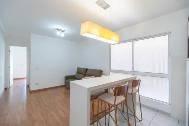 - Sala em um ambiente integrado com a cozinha, possui sofá e mesa alta com banquetas,