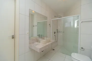 Banheiro social com armário, espelho, box em vidro e piso aquecido