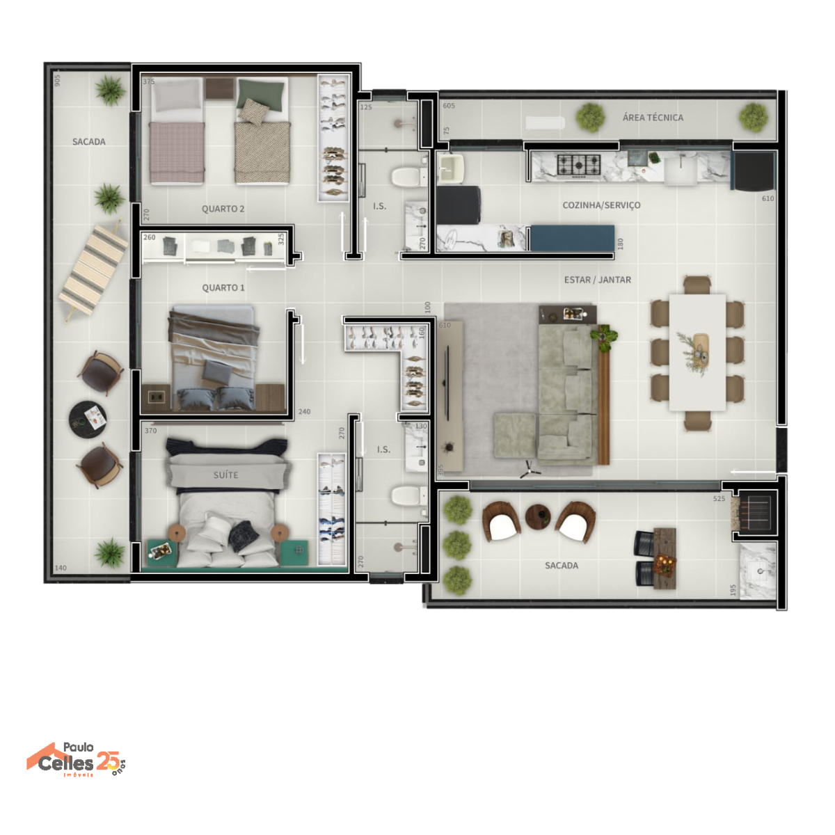 - Dormitórios: 3 quartos, sendo 1 suíte