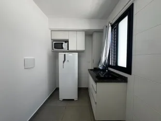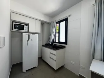 - Cozinha com armários, Micro-ondas, Cooktop elétrico e Geladeira